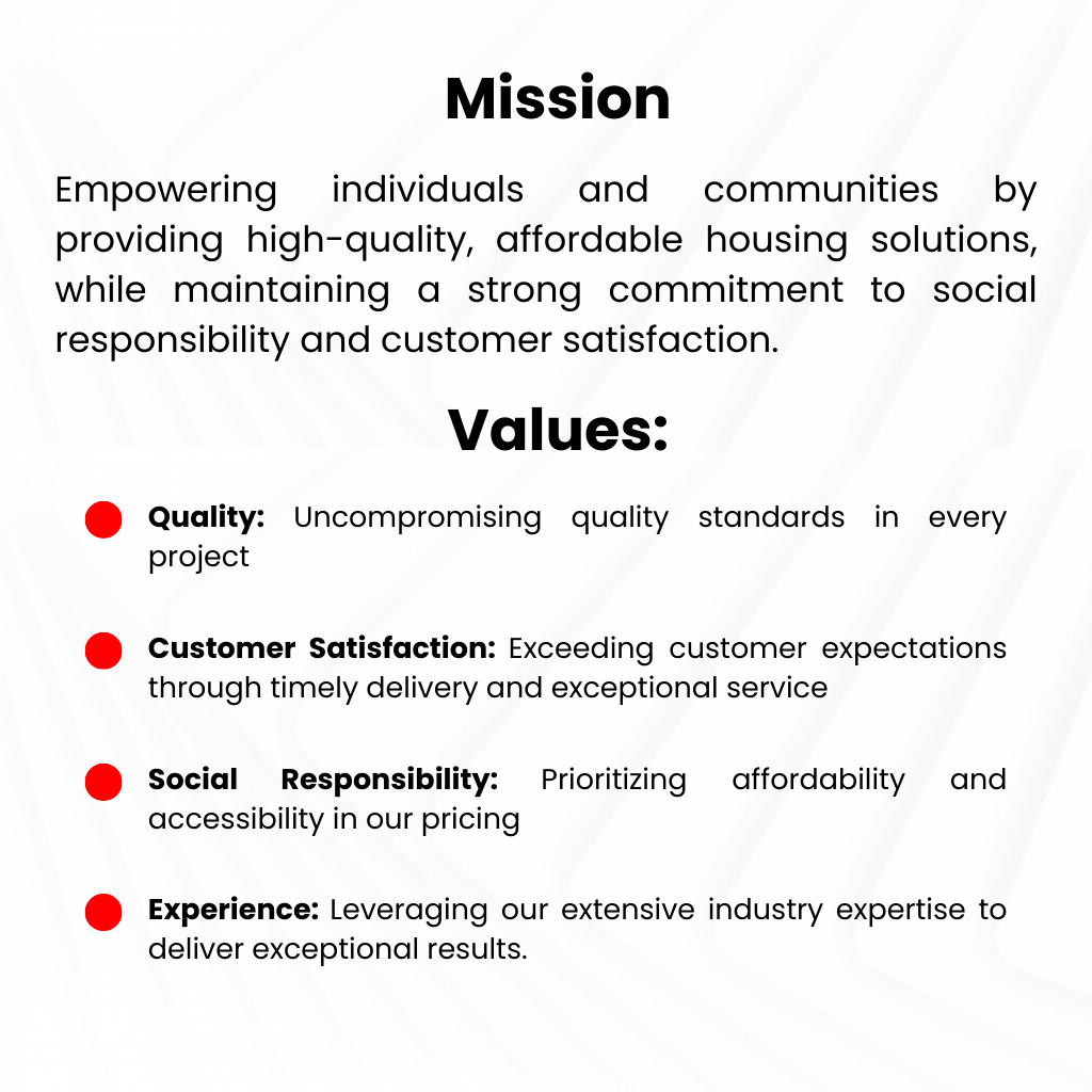 Empowering individuals and communities by providing high-quality, affordable housing solutions, while maintaining a strong commitment to social responsibility and customer satisfaction.